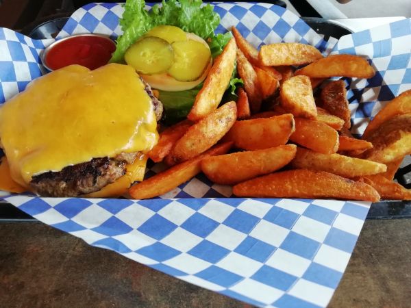 點了一份招牌傑夫漢堡,一份兩個人分就吃的飽,吃完不夠再加點,戶外座位旁邊是海景,非常漂亮,可以拍照,當天是禮拜一早上去,人很少,可以慢慢吃美食邊拍照,雖然我覺得漢堡口味和台灣的差不多,哈哈