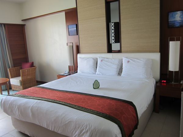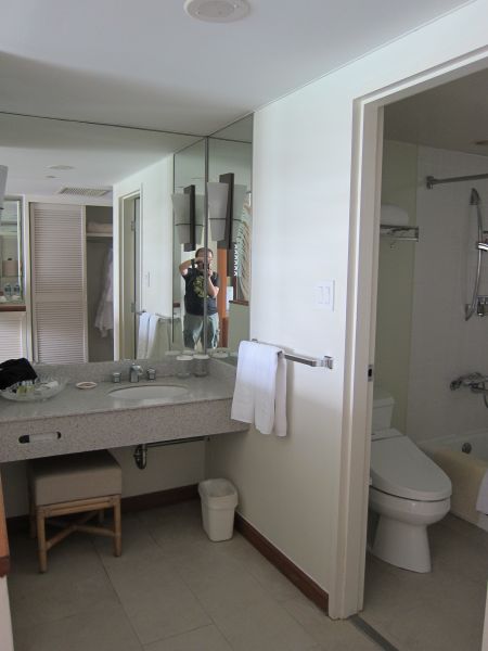 日航飯店的房間相當大,酒店獨特的位置及設計,造成所以房間都是海景房,相較於杜夢灣酒店正面望向水平線的海景,日航從側面飽覽整個杜夢灣有另一種壯麗和漂亮,部分房間站在露台更能看到水晶教堂,有一種浪漫的氣氛。