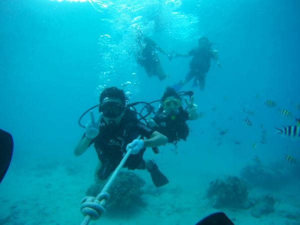第一次潛水沒想到背著氧氣筒全副武裝走到潛點是這麼辛苦的一件事,但一潛下去後不只身體像隻魚一樣輕鬆,海底的景色更讓人驚艷!用熱狗餵魚也很有趣但很怕手指被當成熱狗被咬下去..哈哈,總之愛上了潛水,以後還想再體驗