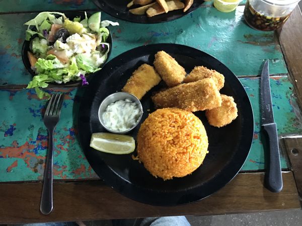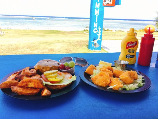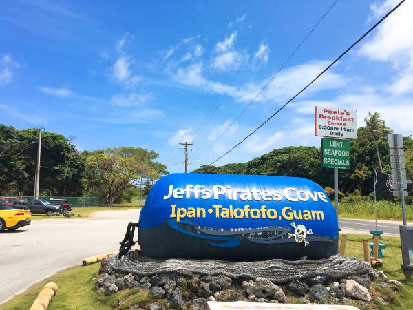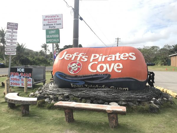 這天透過關島之家的租車,自駕一日遊來到了南部最有名的餐廳,標誌很明顯遠遠的就看得見入口,進入後可以選擇座位(室內區跟室外區),我們選擇坐在室內區;經過一番研究後,點了今日特餐15美金跟1/4漢堡套餐12美金,有免費的冰水跟飲料可以自行取用,趁著備餐的時間到處走走拍照,在後方有個面向大海的籃球場,在室外用餐區的牆壁上有不錯的海盜畫像,回到了座位,發現整個吧檯區是一艘船的造型。 上餐囉!今日特餐是有一份蔬菜沙拉、主餐有6塊炸魚、一碗紅飯和一杯冰紅茶,1/4漢堡套餐有漢堡、洋蔥、番茄、酸黃瓜跟薯條,令人意外的是,用餐完畢會贈送一杯好吃的冰淇淋,完全不甜膩~ 要離開時,帶著帳單到貴檯結帳即可,旁邊有賣許多海盜的商品可以逛逛,憑用餐收據可以打八折!!