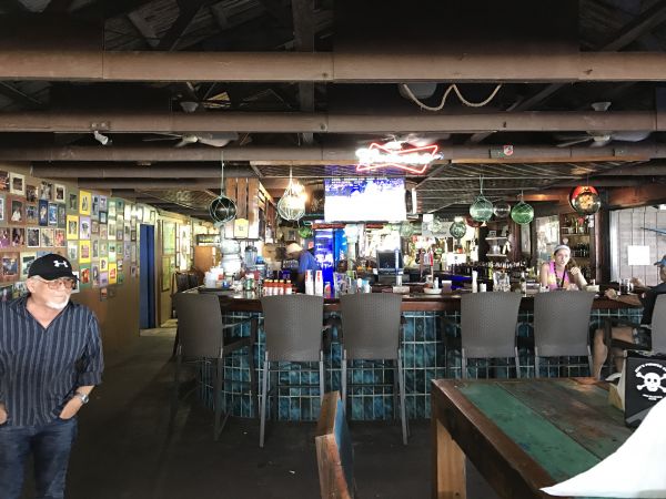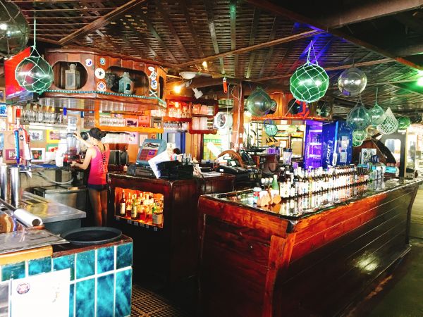 這天透過關島之家的租車,自駕一日遊來到了南部最有名的餐廳,標誌很明顯遠遠的就看得見入口,進入後可以選擇座位(室內區跟室外區),我們選擇坐在室內區;經過一番研究後,點了今日特餐15美金跟1/4漢堡套餐12美金,有免費的冰水跟飲料可以自行取用,趁著備餐的時間到處走走拍照,在後方有個面向大海的籃球場,在室外用餐區的牆壁上有不錯的海盜畫像,回到了座位,發現整個吧檯區是一艘船的造型。