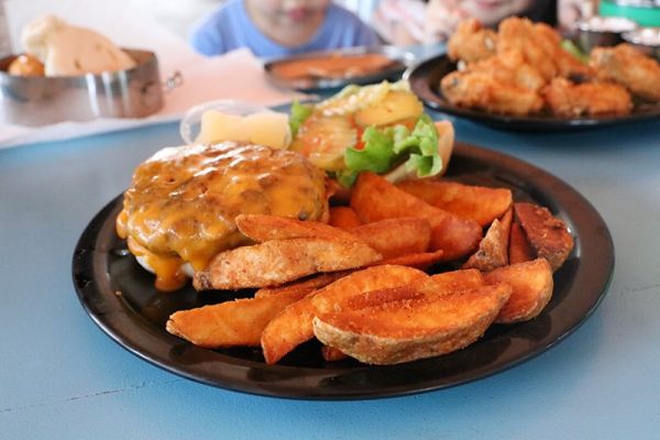 這裡的漢堡肉扎實、漢堡包鬆軟適合小孩、所配的生菜屬於夠味、重口感的類型,所附的酸菜及辣椒酸甜辣夠勁,而炸雞及炸魚的部分大多炸得恰到好處,只有一、兩支雞腿稍嫌乾柴,所附的莎莎醬也能適時解膩,再不然適量的冰水也是足夠讓人一口接一口,是一早奔波後休憩、填胃的好地方。