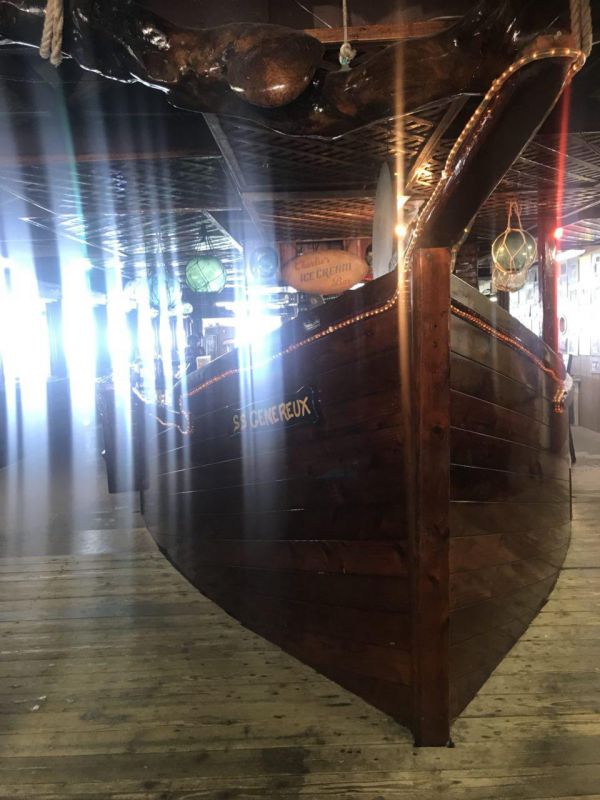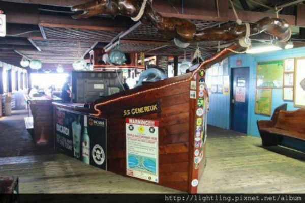 今天來到Jeff’s Pirates Cove 傑夫海盜餐廳吃飯,整間店面滿滿的海盜,吧台區是一艘船尾造型,抵達時是下午三點多,還好店內沒有很多人,坐在面海的座位~點了炸雞喝著飲料看海景好是愜意阿,因為吃過午餐才過來吃不下招牌海盜漢堡有點可惜。櫃台旁有販售一些海盜的紀念品、T恤~