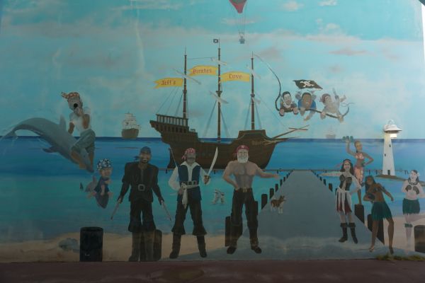 海盜船餐廳Jeff's Pirates Cove結合商店 + 餐廳,裡面有買關於海盜的產品,戶外也有很多壁畫,很好拍!! 招牌漢堡好好吃~ 上面還洛印了海盜圖案,剛好遇到海盜船長,一起拍了好幾張照片。想來這邊吃漢堡的人要早點來喔~ 因為他們6點就關門了 > <