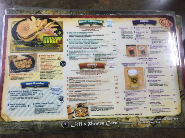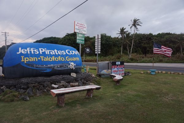 餐不錯吃風景也很棒 餐廳後面有海盜圖案的帆船很適合拍照 可以邊吃美食邊欣賞關島海景 幸運的話還可以遇到傑夫本人 剛好車停完下來就看到了XD 這裡也販售明信片(比外面超市便宜) 跟一些有關海盜的商品