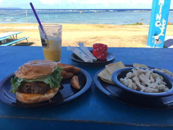 在關島環島的其中一站必定是要來吃傑夫海盜餐廳^^果然跟我們一樣慕名而來的人非常多^^這次的伴手禮是非常時尚的頭巾^^有些人當領巾 手巾 頭巾haha男女老少都有帶上超cute~就是照片上的紅色骷魯頭巾^^我個人很喜歡^^我們的座位面海~一邊吹海風一邊吃飯就是愜意^^我們點了一個漢堡一個芒果冰沙一個道地查莫洛人料理~漢堡上面還有招牌海盜標記~美國牛肉漢堡就是好吃^^傳統的道地料理有很爽口醬汁很酸我們選了雞肉(有魚跟雞可以選)我覺得炎熱的關島非常合適~不過麵包皮的味道我沒有很喜歡就是,但老公表示來到此地還是要試試當地料理^^再來就是芒果冰沙很好喝非常解熱解膩~~老實說要不開車我覺得來杯啤酒更是適合不過^^推薦喔