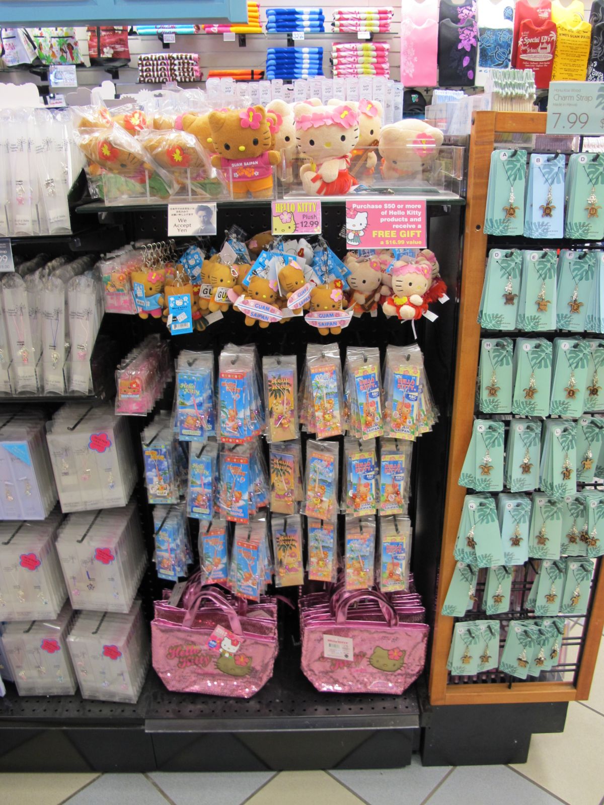 關島每個大百貨裡面幾乎都可以看到ABC商店,這次去直接鎖定了ABC商店裡面的烤焦Hello Kitty,畢竟只有這兒有賣啊! 一口氣掃了15隻,結帳店員刷到手都痠了XD 如果想要買紀念品的人,ABC商店絕對是最佳的選擇,有磁鐵、鑰匙圈等等選項,價格不算太高,質感也相當之好喔!