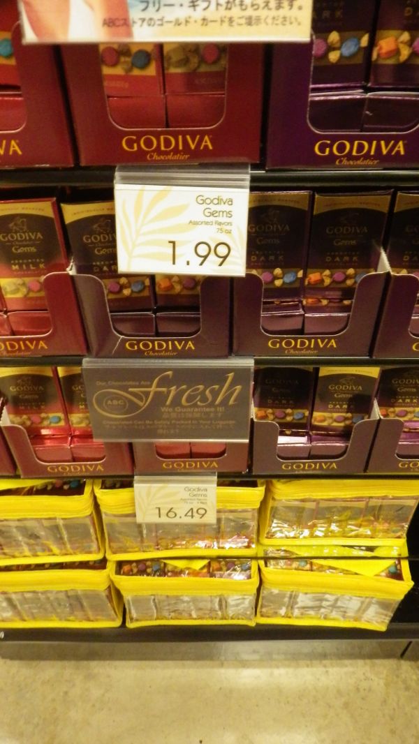 ABC Store就像是台灣的便利商店,到處都能看到,可能大部分東西的價錢不像K-MART便宜,但可以解決臨時的小狀況,渴了想買個飲料,半夜想小酌一番走出飯店附近就有,在台灣很貴的GODIVA巧克力也可以在這裡購買,送禮自用兩相宜!