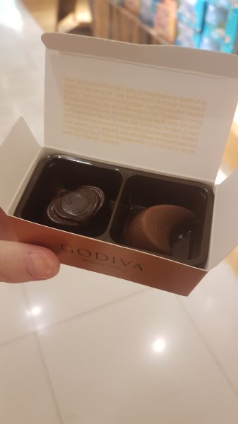 到關島必到DFS,這次很特別~旅行社給了我們GODIVA兌換券~到DFS櫃檯就可以換,本以為是換一小片,居然是一盒兩顆裝,超大氣搭~在台灣這兩顆也要百來元押~哈!到DFS不外乎一定要購入保養品,一到就看到MAC...等專櫃一堆人,也讓我和同行友人在契爾氏掃了一堆貨~笑。