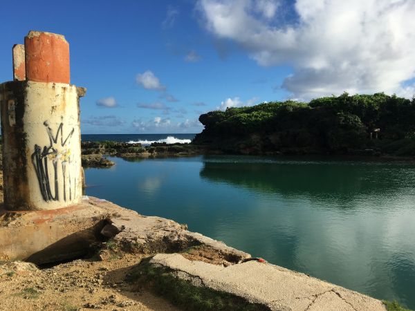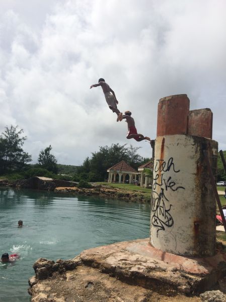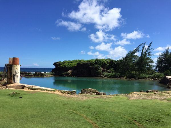 這裡應該是我對南部觀光映像最美的地方,天然形成的池塘,在池塘裡也都看的到魚,可惜沒有看到有人跳水的畫面,旁邊有個小道一定要走上去,這裡可以仰望大海和天然池的交界與面貌,你才能體會原來關島真的是珊瑚礁保護跟它的特別~