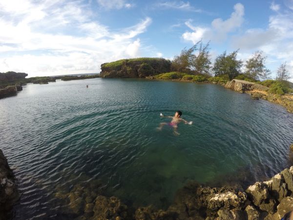 關島伊納拉漢天然池是我們環島的第一站,這天到的時候只有一外老外國先生泡在水裡,我們待了一陣子陸陸續續到的都是當第人去烤肉,超級悠閒~天然形成的海水游泳池就在馬路旁邊,天空超藍水溫很舒服,池旁邊還有個往上的梯子還有個長石椅可以把整片海域一覽無疑,坐在那邊看著海看著天 人簡直靈魂出竅了!大推薦環島一定要停留