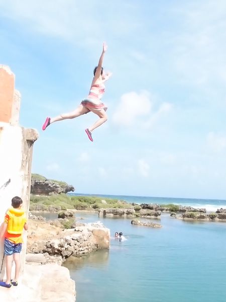 有時間的朋友,去跳水吧! 難得都飛到關島來了~一定要體驗當地人的休閒活動啊! 好玩好玩~我一連跳了十幾次~ 第一次心裡超級怕...先從矮的路面往下跳 跳個幾次,膽子大了之後 再爬上去最高點往下跳 好過癮啊!