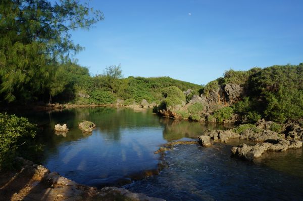 開車環島,伊納拉漢天然池是4號公路景點之一, 天然池是我們待比較久的點, 因為太熱了~~趁機泡泡水消暑一下, 清澈的水面倒映著藍天,讓心很平靜,步調整個慢下來。 天然池不像沙灘危險,不少在地人帶著小小孩來此玩水。