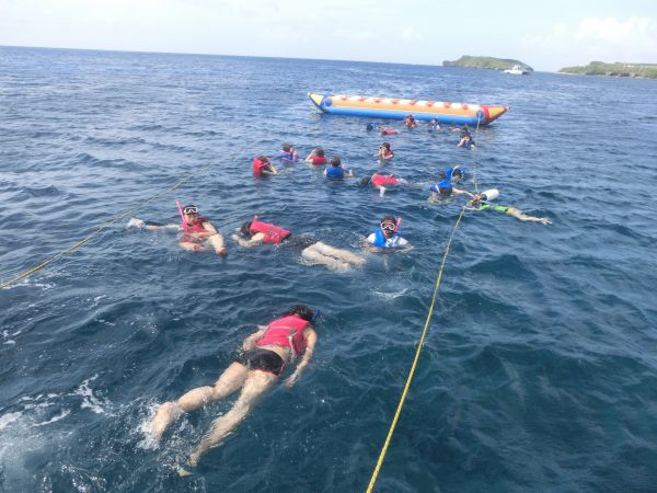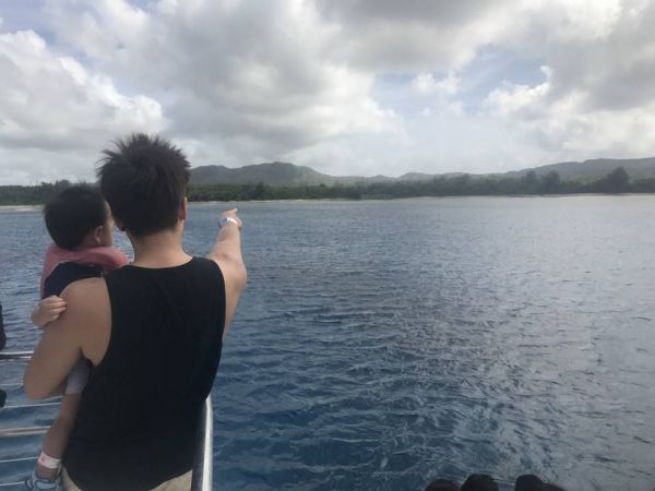 一早我們坐第一班的船出海,會先坐非常溫和的香蕉船,哈哈!就像在海上吹風很舒服不刺激啦!再來就是找海豚了!關島海豚超多的!一下就找到好幾群!接下來會放我們再海中間浮潛!非常的漂亮!回岸上後有簡單的午餐可以吃到飽!海邊的設施也都能玩!很不錯哦!
