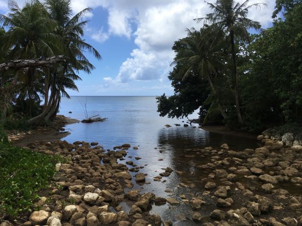 往南來到西班牙古橋。通往古橋的招牌前有數個停車位,看滿多租車的觀光客都會去瞧瞧這個有趣的小景點。 一開始心裡真的會冒出"啥?! 這小橋也算景點?"不過後來稍微改觀,雖說只是個只有雙拱體的小石橋,但遠眺出去的海景著實令人驚訝之美。 而孩子們對於橋邊掉下來關島芒果更感興趣的樣子,觀察許久。 橋邊的雜貨店看起來好像沒有營業了,不過不是很確定,只好提醒大家注意一下唷~~