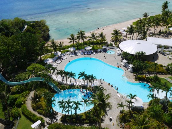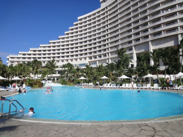 日航飯店的大廳很寬敞.一進眼簾的是一大座的戶外泳池.蔚藍的天空.棕梠樹.因為住在15樓房間的VIEW非常好.飯店的沙灘珊瑚礁較多些.建議要穿上膠鞋較安全.在這裡賞夕陽.還可以遠眺戀人岬.很浪漫喔