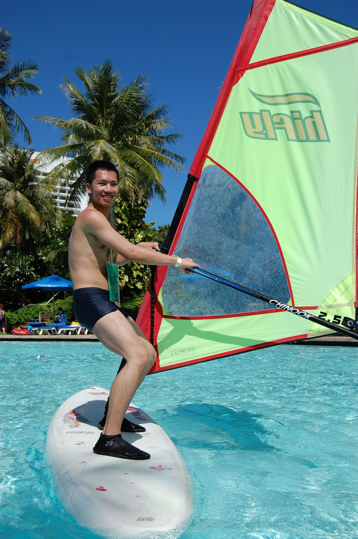 到PIC一定要去報名風帆活動!!他會先幫你上約半個鐘頭的課程(全程英文講解),但如果英文不太好~可以請教練說慢一點~~會教你先在游泳池練習~然後再到海上實地操作~~其實不會很困難~但真的很好玩~~~~(照片是出賣朋友練習的英姿)