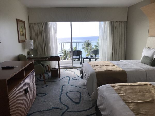 我們在訂飯店之前也比較了很多不同的飯店,悅泰飯店價格跟四星級的差不多(暑假價格來說),品質屬於四點五到五星級的飯店,屬於CP值較高的飯店,導遊也告訴我們若他的家人來關島玩,也是推薦家人住悅泰飯店唷!而且離沙灘超級近,越過飯店內游泳池就到了,到海灘遊玩若需要租借用具,也可以向旁邊小店租借喔!我們住的是面海房,房間內也很乾淨,有一個小陽台,一打開就看大海喔!但我覺得大廳與房間內廁所就比較普通,就價格、陽台海景、沙灘等等,整體而言,我覺得很棒!