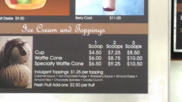 入住Fiesta的每位房客均贈送一張的冰淇淋兌換卷,價值4.5美元,如果改成用脆皮甜筒waffle cone裝則需再加1.5美元,附上價格表讓大家參考,店員也推薦了一款最受顧客歡迎的口味Macadamia Nut Brittle夏威夷脆果仁口味,不論你是否住在悅泰都可以進來嘗試一下喔。
