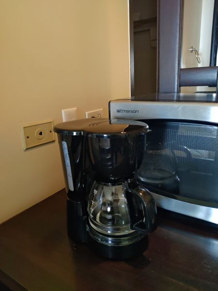 飯店房間能直接看到整個杜夢灣,房間有保險箱、微波爐、 咖啡壺,非常方便,我們都拿房間的冰桶都走廊去裝冰塊,拿回房間給咖啡壺加熱,就可以拿來泡咖啡或泡麵了,製冰機在奇數樓層才有喔。 冷氣非常強,有陽台,去玩水後可以把衣服曬在陽台,可以自己帶曬衣繩和衣架去,很方便喔。