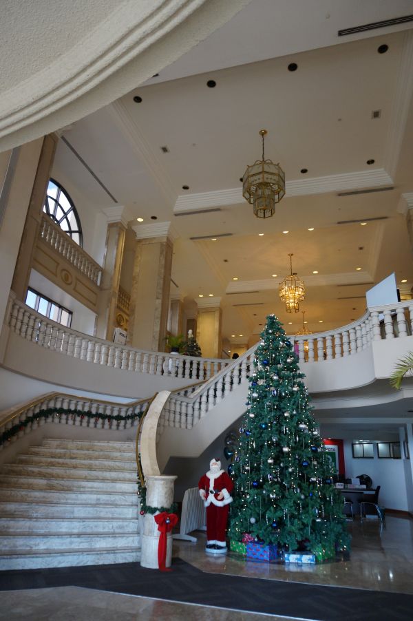 假日飯店一樓採挑高設計,旋轉梯旁搭上應景的聖誕樹,非常漂亮。