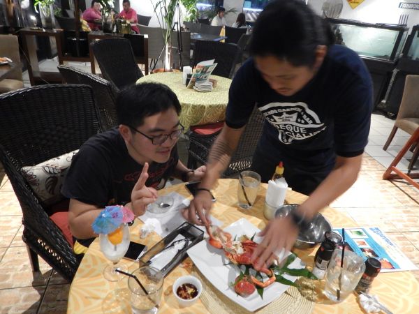 晚上在飯店等待事先預訂的Core BBQ Garden & Bar接送,吃了關島最豪華的一餐,活跳跳龍蝦搭配一整塊牛排耶!真是太滿足了啦~~