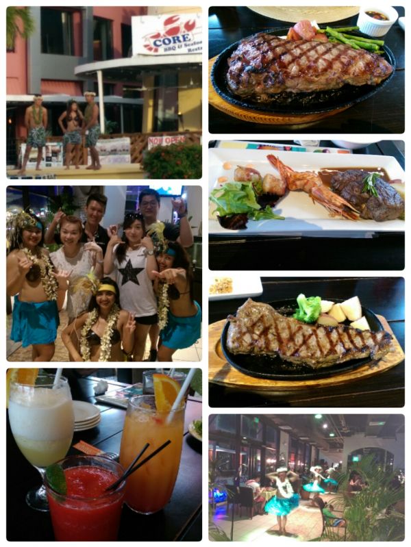 選擇Core BBQ作為我們結婚一週年的慶祝大餐還挺不錯的,但餐廳已經換地址,在藤一番拉麵對面囉~因為旅行社代訂有少10%所以是請旅行社代訂的,龍蝦好鮮甜、但大牡蠣腦公說味道怪怪的,牛排一上桌果然沒讓我們失望,老公都露出誇張的表情來表示贊同了,飲料第一輪先提供雞尾酒,第二輪還有飲料跟啤酒可以選擇,而因為6:30表演就開始,所以建議可以6點就到餐廳,雖然是只有4人的舞群,但舞者還是很賣力表演唷,表演結束還可以跟舞者拍照留念,要記得給一點小費就是了。