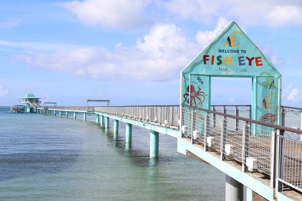 通往魚眼塔的情人橋旁,可以看到許多體驗潛水的潛水員在練習,關島的海水好清澈,且因為關島的是珊瑚礁島嶼,離邊岸約80~100公尺處的水深只到成人腰部。進到魚眼塔10米深的觀景窗,除了可以看到熱帶魚和珊瑚群,運氣好的時候還可以看到潛水客,潛水教練很可愛會特地游到窗邊跟塔裡的人互動。