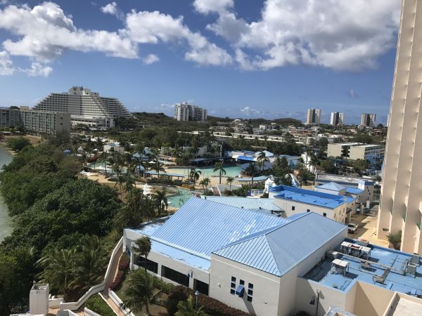 這裡台灣人不多,大都是日、韓籍旅客,但都相當有禮貌及人情味。早餐券可以午餐使用,餐點內容多樣,有美、日、韓口味,絕對滿足味蕾。 提早兩個月前預定因此得到wing 16F的面海五人房,房間內相當寬敞、乾淨,陽台落地窗面對的是整個Agana灣,幾乎躺在這就能待上一整天。飯店室內、外的娛樂設施健全滿足休閒需求。有獨立沙灘及游泳池可供休憩,水上設施更是不容錯過,其中獨木舟可以划至對面的無人島、充分體驗划船樂趣、水上樂園更是一絕適合各年齡層使用。