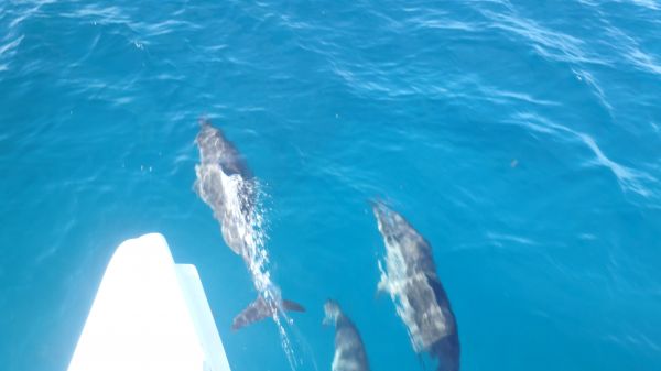 坐在船頭吹著海風,雖然有點曬,但感覺是舒服的,船長會先帶著我們去找海豚,我們很幸運的開了一小段就遇到海豚媽媽帶著寶寶一起遊,