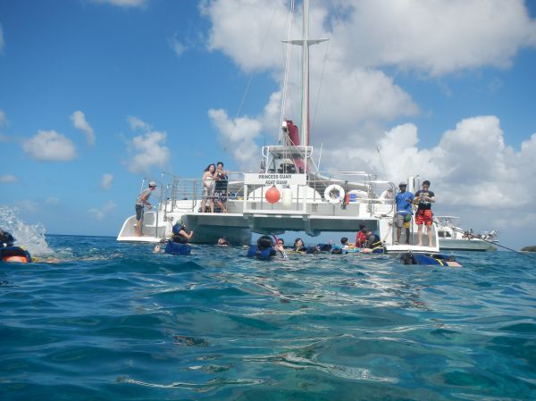 早上本來是約第一趟的船要出海 , 但是我們都很珍惜在關島的每一時刻 , 想當然早上的起床實在是很掙扎 , 所以 , 我們當然就延誤了 , 還是感謝親切地感謝來至台灣的老闆娘 , 讓我們改早上的第二趟船出海 , 由飯店出發一路順暢 , 時間還有就讓我們參觀了快到港口路上的麥當勞 , 稀奇的是他是全關島最小的麥當勞 , 也是我看過最小的 , 但他可是五臟俱全喔!! 上船後不久下雨了 , 正想應該沒機會看到海豚 , 倒是看到飛魚到處飛著亂竄 ; 不久 , 看到海裡幾團的黑影往船這過來 , 突然地躍出水面 , 哇!海豚吔.....這比我在澳洲餵海豚看得更真實 , 又是跳躍又是翻滾的 , 目不暇給 , 船長和船員們也都很親切熱情的招呼著我們 , 又是浮潛又是釣魚的 , 這趟的美人魚公主號真的很值得 , 推薦給大家 ......