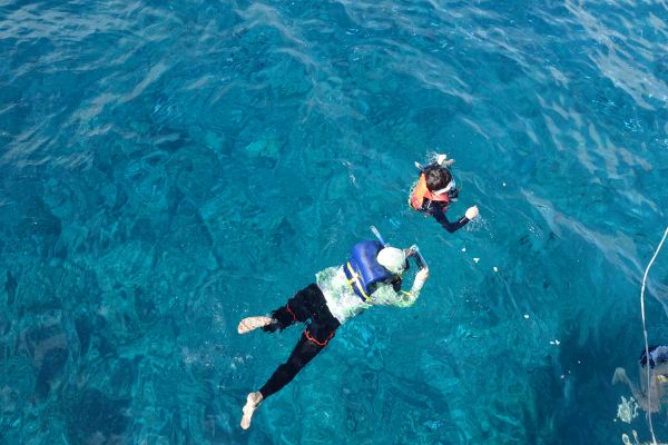 看完海豚後,最有意思的活動當然是浮潛囉,穿著救生衣,踩不底的感覺有點驚驚,海水超鹹,喝了好幾口,嘴巴都乾了 @@