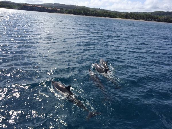 出發囉美人魚公主號~~~不得不說這真的很值得全家大小來參與的活動!(就連高齡80的阿公也坐得穩穩地啦)這個行程活動也包誇了飯店的接送,船上兩小時的內容有追逐海豚\釣魚\浮淺,一開始會在沿路上遠觀海豚的蹤跡(看看有沒有跳出水面的水花)然後就登船哩!船上有小點心咖啡可以食用,海豚不一定每次都會追到,這次有看到小海豚的身影真的太酷了!!他們會成群結隊蹦蹦跳跳的跟你say hi~還有可以躺在編織網上享受陽光~盡情的日曬吧!是一個完全放空腦袋的行程!享受關島的海風關島的陽光