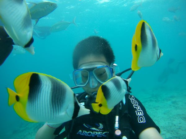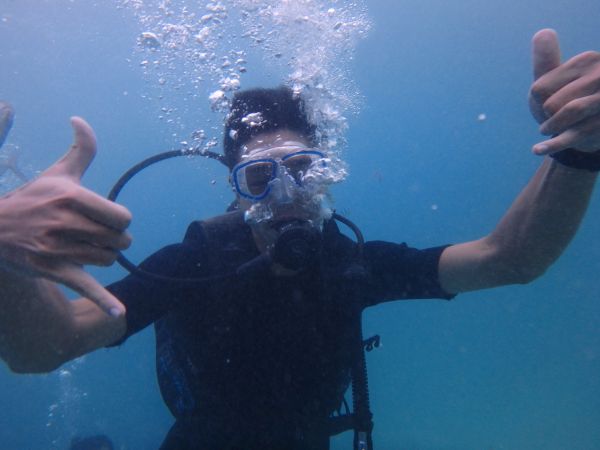 到了關島,就要水肺淺水!這一次的淺水真的很有趣!剛開始淺水的時候,原本耳朵痛痛的,還以為出了甚麼事,但是經過教練細心的幫忙,耳朵就好多了,而且來關島潛水完全不需要會游泳,所以就算是一個不會游泳的人,也能在水裡悠然自得!