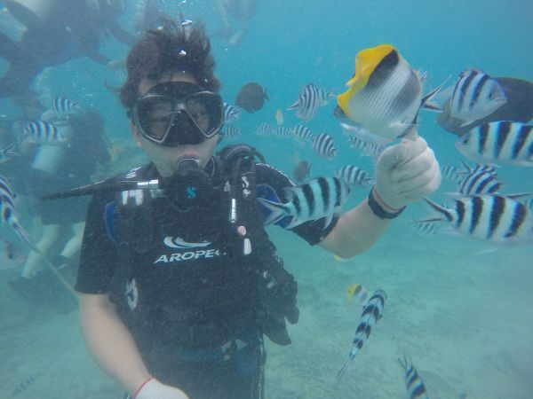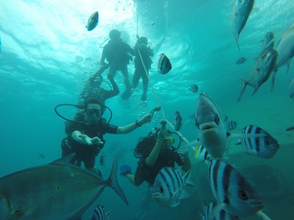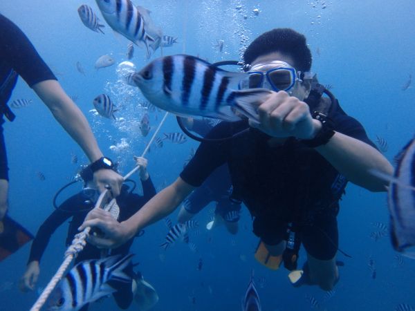 水肺潛水真的比浮潛簡單、有趣! 只要會呼吸,水肺潛水真的比浮潛簡單,而且可以非常近距離與魚互動 在這裡水的能見度非常的高,魚也非常多,教練還會發熱狗給大家餵食,但是要記得不要一次把整個熱狗的露出來,不然魚會一擁而上,瞬間熱狗就被叼走了。 此外這裡只要你沒問題,不用潛水執照也可以放開繩索,自己在海裡游泳,真的是非常好的體驗!
