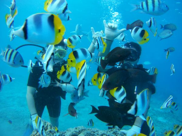 教練首先會在亭子裏教授基本的潛水技巧和溝通方法,然後帶到淺水的地方練習,教練覺得ok,就會給繩,把你拉下去。整個過程其實自己大可以不必動,因為教練會拖著你走。他也會給你香腸,引誘魚兒走過來。有時候,就算沒有香腸也可以欺騙魚游過來的。