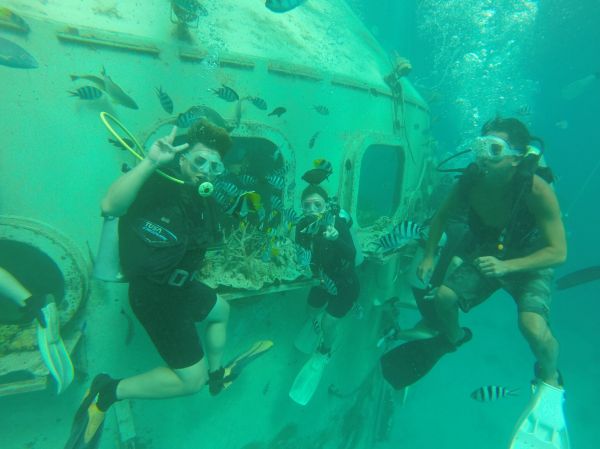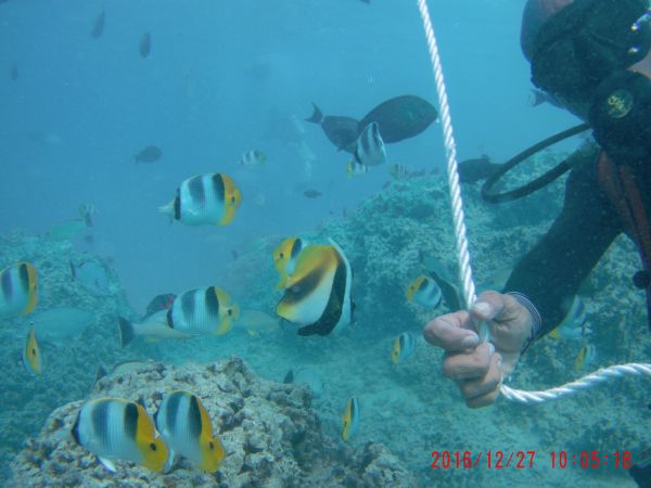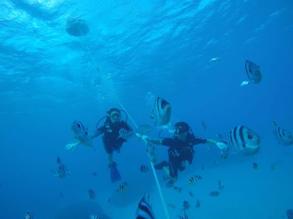 很開心第一次深潛遇到的團隊是JNS DIVERS,老闆娘姍姍非常的溫柔、細心又熱情,身材也很好唷:P 深潛之前也會一再確認每一位體驗者都懂基本動作與指示。這次很幸運的是老闆Jeff擔任我們的教練,聽說他八歲就開始潛水了呢! 可能我們的狀況不錯,Jeff有待我們到外面一些且放我們自己潛不必依靠繩索,水下的世界真的很美,深潛的感覺也很奇妙,雖然喂魚有不小心被飢餓的魚群嚇到,但整體來說是非常棒的體驗!