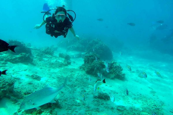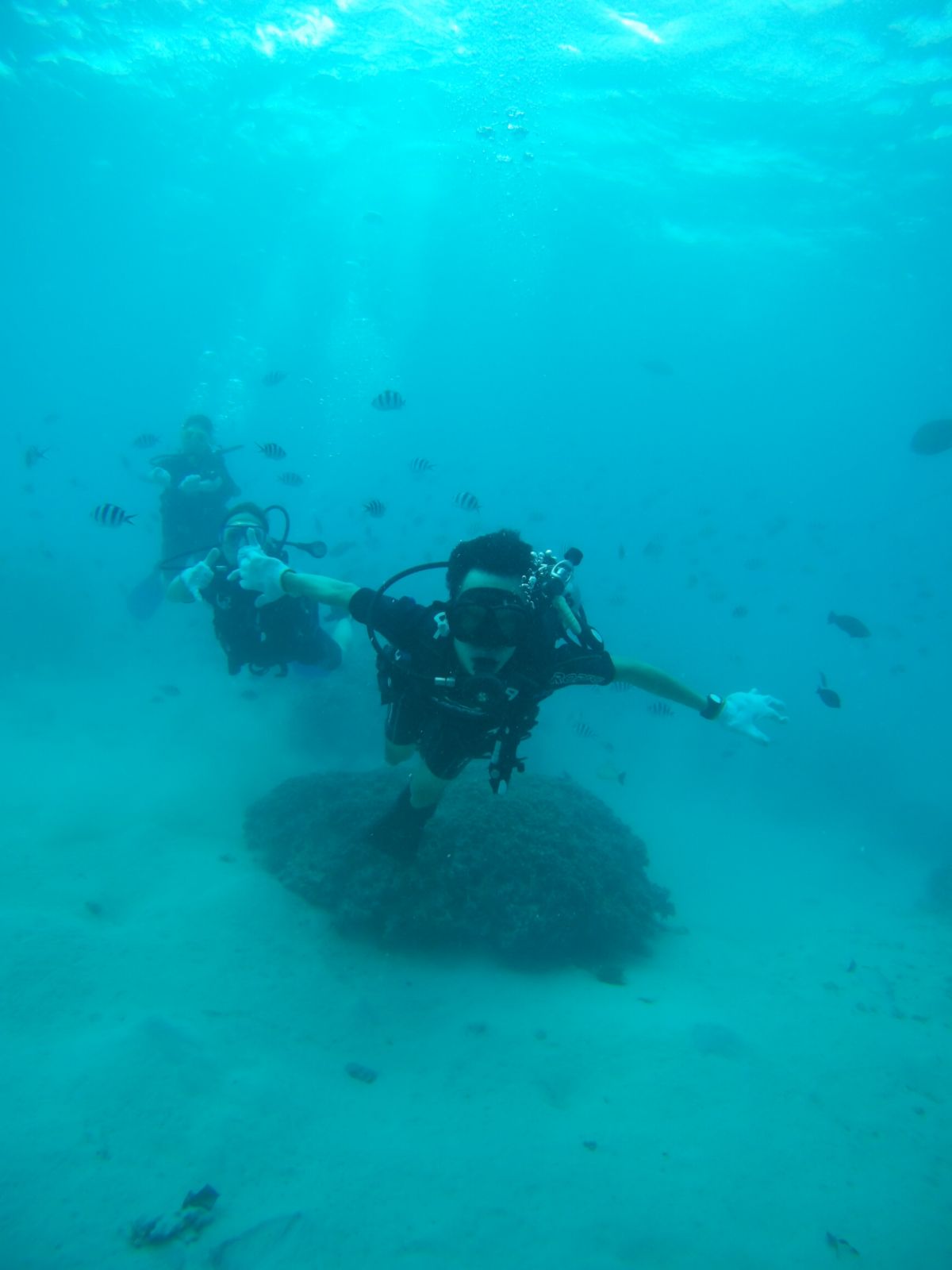 在水中先練習,加上是平靜無浪的水域,讓人感覺很放心,即使不會游泳,也能體驗水肺潛水(scuba diving)的樂趣,和熱帶魚們一起游泳,跟浮潛很不一樣呢!