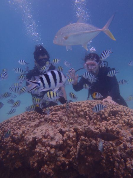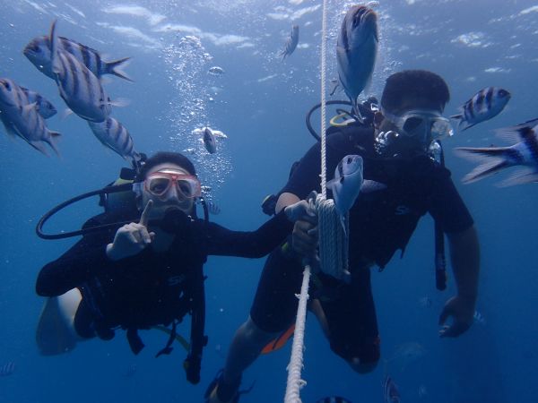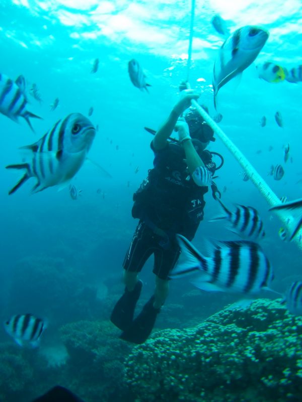 第一次潛水的我很緊張, 但在教練細心的解說下一下子就進入狀況了。與魚兒們共遊是很新鮮的體驗。海底世界真的很美!