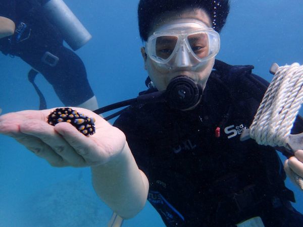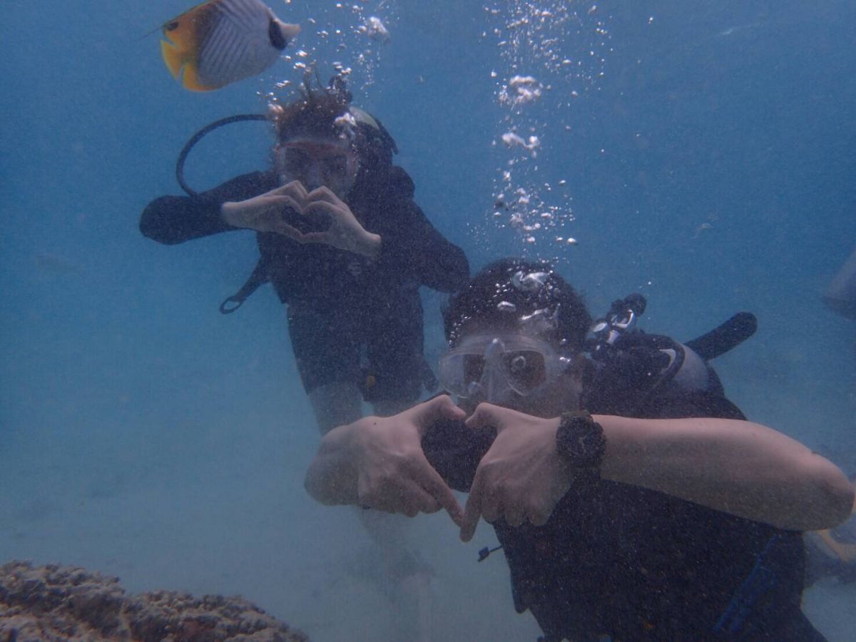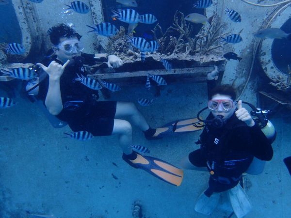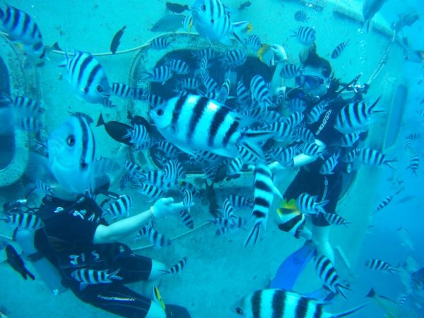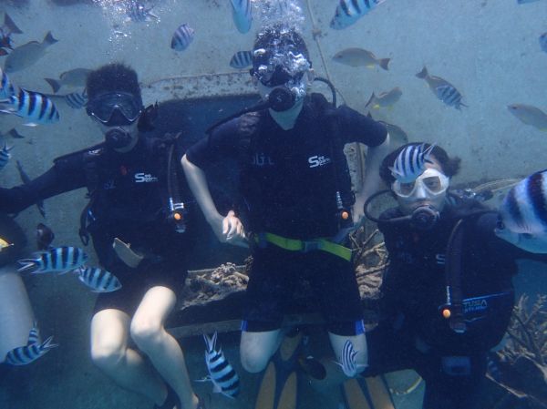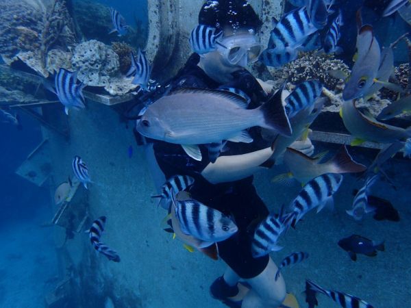 說到水上活動當然少不了潛水,我們選擇的是水肺潛水,而且完全不用擔心語言問題,能夠在水中跟魚兒共游的體驗真的很棒,教練也隨時關心著你的狀況,只要能適應耳壓,就能夠優游的餵魚,我們還可以跟室內的遊客相對望,真的是非常有趣!