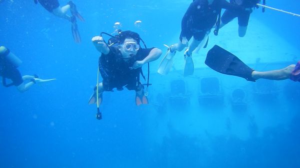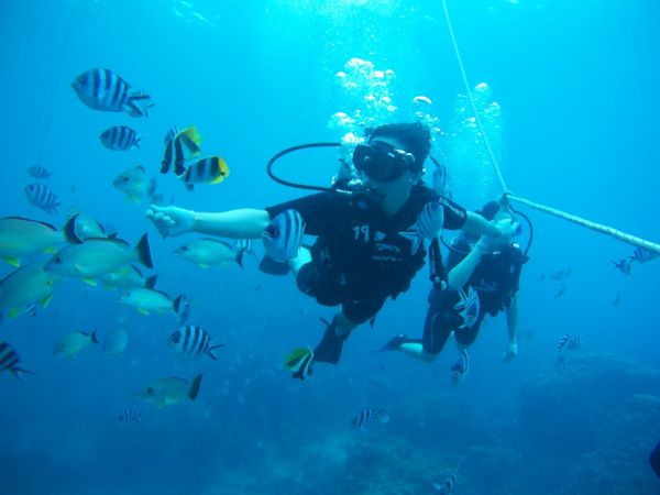 是勇氣讓不會游泳又怕水的我、穿上裝備揹上氧氣瓶、緩緩的潛入海底!魚很多、海很美,還能拍照留紀念、很棒很值得去看看海底的世界!!在海裡餵魚又是是一種不同的體驗!