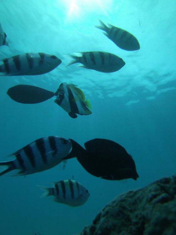 我們的潛水點就在著名的魚眼公園,這裡有許多觀光客在看著我們潛水紛紛投注羨慕的眼光,嘿嘿!或說回來關島的海水真的很清澈,我們之前去過泰國蘇美島、印尼巴里島,都沒有看過那麼乾淨的海水,教練帶我們慢慢潛下約6公尺深的海底,手裡握著食物魚群很快就圍了過來,看到大群的熱帶魚真的很過癮,彷彿感受到原來人類不只是陸地上的生物,還可以與海裡的動物共生共存,海底的寧靜只聽得到自己的呼吸聲,這種和諧感在我的心中留下永遠的美好回憶!下次還有機會再來關島我一定會再回來看看這片寧靜又優美的海底世界。