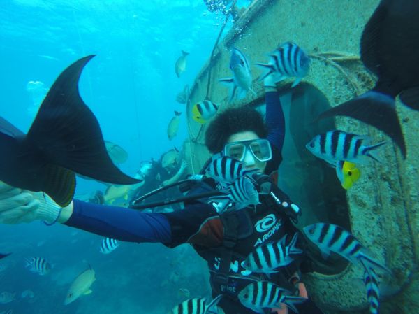 潛水區的海水真的很清澈,大小魚都不太怕人,只要一拿出熱狗就會瘋狂被搶食,更驚喜的是這次的潛水體驗有鯊魚游過去唷!