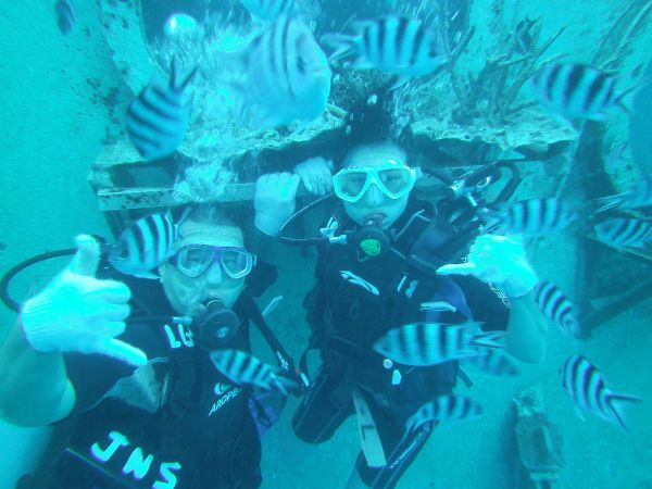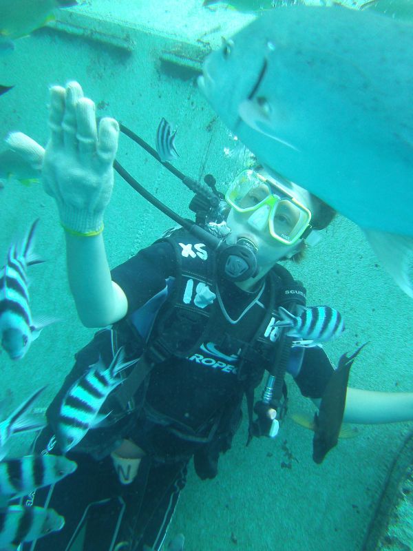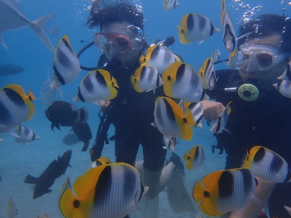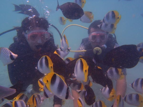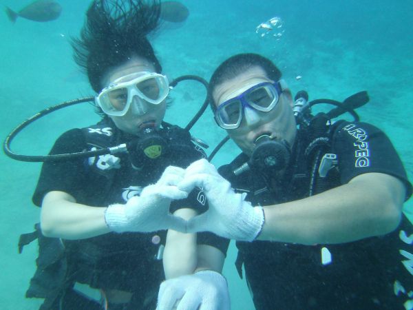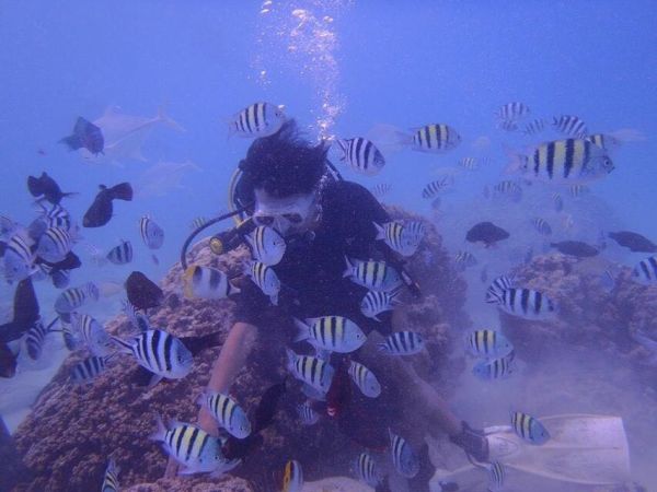 潛水在台灣沒有執照,根本無法參與 去關島時,這也成為我必玩的項目 在還沒前進關島.我自己就先找好有中文教練的潛水公司 畢竟第一次玩潛水,還是要找較能信賴,評價高的潛水公司 果然沒讓我失望 教練用中文詳細的介紹潛水會遇到的狀況.手勢等等 也很有耐心的行前訓練 讓我們很順利的潛到水中 看到早晨很餓的熱帶魚, 親自餵食牠們.真的很有趣.很興奮 在關島的潛水真的很安全,水的深度,潛水的帶領方式 都相當有水準,也可靠, 來到關島一定要體驗水肺潛水 和熱帶魚一同悠遊在關島清澈的海裡!