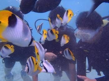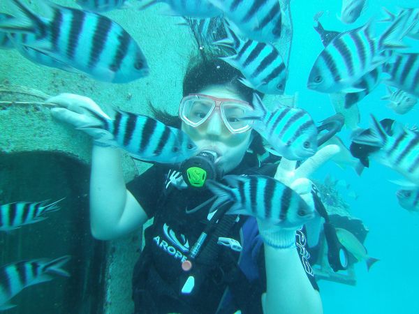 本身就非常喜歡潛水,所以來到可以潛水的關島一定不能錯過! 這次選擇的是小康,有中文的解說教練,所以就算沒有潛水過也不用擔心。其他的教練也都非常活潑有趣,所以整趟海底旅程都非常好玩喔! 每個地方的海底世界都長得不一樣,關島的海底感覺非常清澈,一望無際,礁石沒有很多,但是這次我感覺看到比較多的魚種,而且還可以餵魚,真的要小心,因為手指頭似乎就被魚鰭給畫傷了!但是覺得很值得~~呵呵! 選擇購買照片後,晚上他們會送至飯店櫃檯,再去拿就可以了,難得在關島海底旅遊,似乎一定要把照片帶回家,才有滿滿的回憶!
