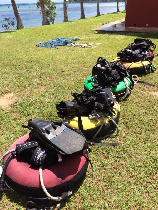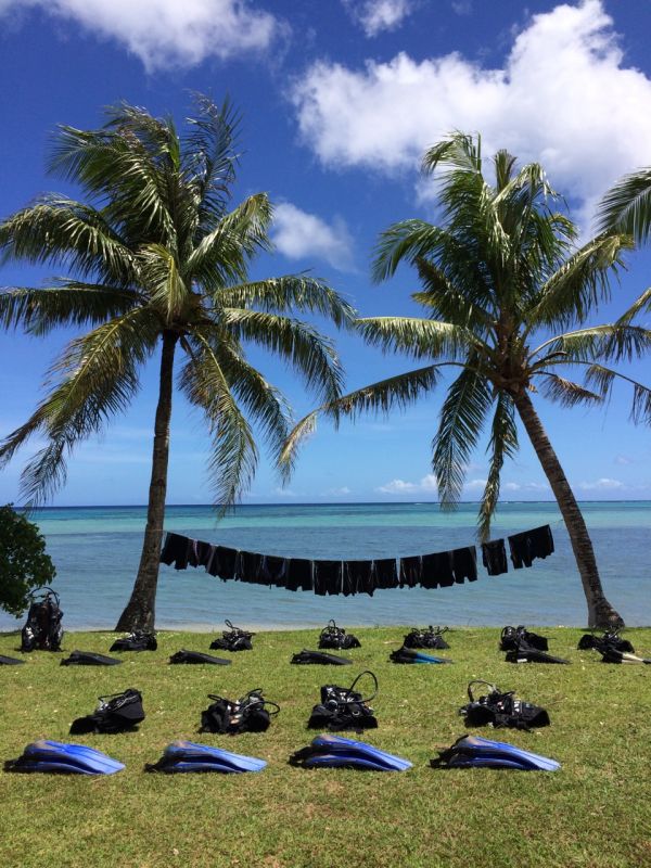 在臺灣去過綠島、蘭嶼、澎湖、小琉球的浮潛,就是沒有背著氧氣瓶下去潛水過,第一次的水肺潛水就獻給關島啦~剛開始不習慣,蛙鏡進水鼻子也進水超不舒服的,但教練耐心的幫助下,後來根本有悠遊大海的fu啦~這裡的珊瑚礁雖然沒有小琉球美,但魚的種類好多好彩色喔~真的很推薦大家一定要試試水肺潛水啦!