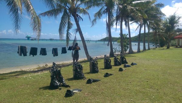 在魚眼公園 體驗潛水也是在關島一定要玩的啦 阿物旅遊書上的JNS潛水店便是我的選擇 (旅遊書蠻好用的)。 原本預約第一天下午的行程 因為鬧鐘響起台灣時間 害的我第二天才獨自前往 也得到 睡過頭哥 這個搞笑的外號 老闆娘用親切的國語教導潛水要注意的各種事項 而一旁的潛水教練們一直在搞笑 緩和下潛前的緊張感 相較隔壁日本人嚴肅潛水團 我們這邊氣氛很歡樂 哈哈~ 下水後當然就是好好的欣賞海底下的美景 好好玩 若自己有防水相機 蠻建議帶去的 下水狂拍就對了!