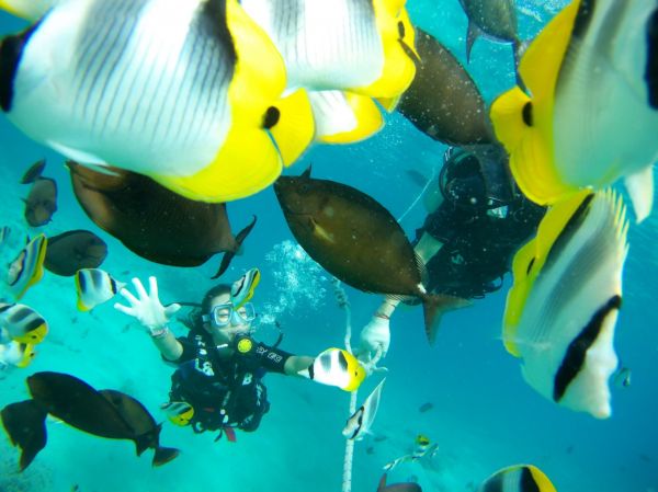第一次深海潛水,原來海裡面很溫暖,反而浮出水面時,才會感到寒冷,教練們都很熱心教我們如何在潛水的那30分鐘過程中,克服遇到的困難,避免我們在海裡面有不適應的問題產生。 一早,巨蟹座老闆姍姍來飯店接送我們~~是一個大美人老闆無誤,她是台灣人喔~~她跟她丈夫的美麗愛情故事,真是令人佩服,姍姍好厲害~~~勇氣十足壓!! 潛水過程中,教練有發熱狗給我們餵魚,其實有點小恐怖,感覺那些魚好餓~~哈哈!!!! 超推薦大家可以來參加~~建議可以預約早上唷!!!! 這樣下午可以到別的地方逛逛~~而且早上體力也十足阿!!