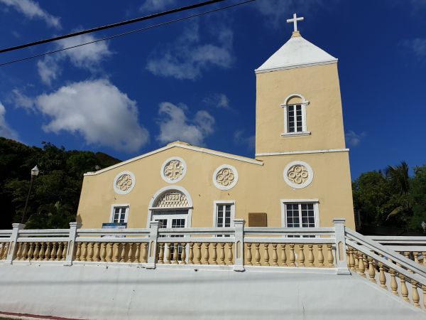 我們開車經過這裡就覺得黃色建築物好可愛,後來發現是西班牙特色的教堂,停車下來拍拍照,也看到很多人租跑車來這裡拍海景,非常美!