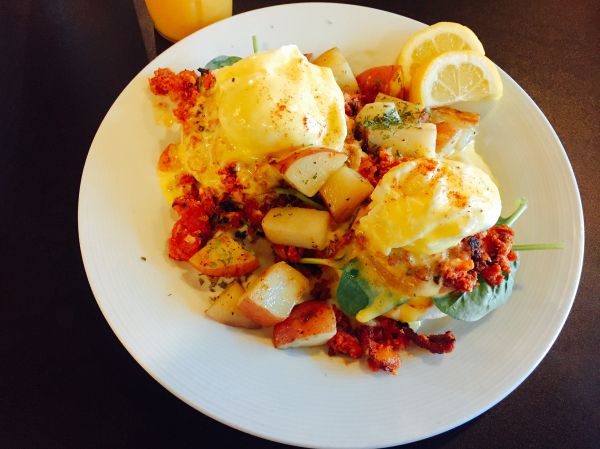 聽說這是廣受當地人好評的早午餐,當天十點多到,人就很多了!但是好像都是觀光客居多。當天點的是有名的班尼迪克蛋,份量真的很多!裡面有兩份麵包跟兩份的班尼迪克蛋,真的不用擔心吃不飽,記得它們的餐都沒附飲料,不過可以點水,是不另收費的哦!